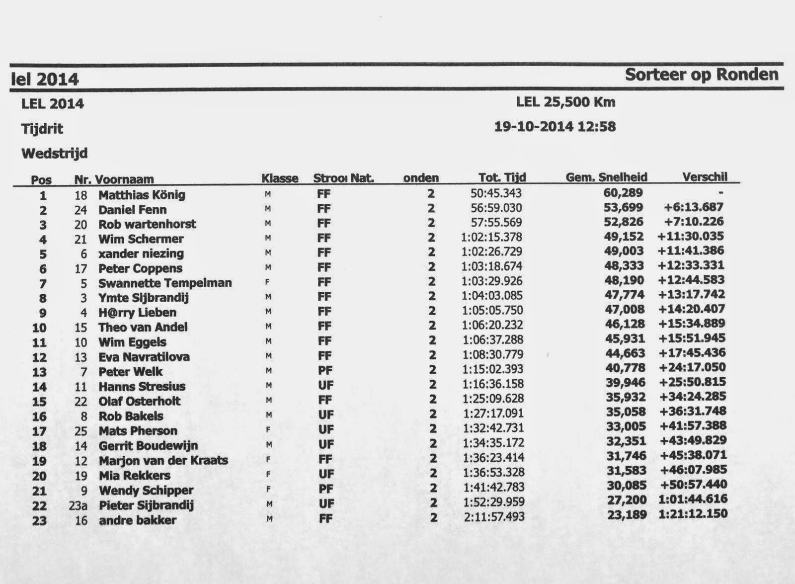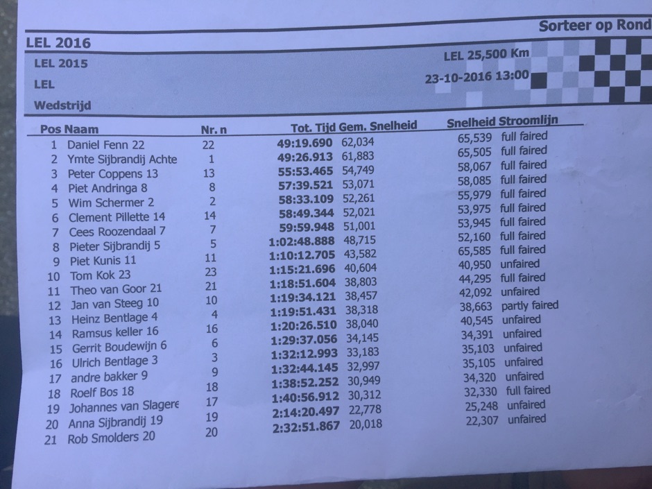 Ymte reed met tubeless banden. Theo van G’s rode DF was weer als nieuw. Piet K. reed mee met de Super Mango. Hij staat geregistreerd met de snelste tijd met 65,585 kilometer per uur gemiddeld tot het keerpunt maar eindigde met een gemiddelde van 43,582. Hij had geen lekke band op de terugweg dus er is waarschijnlijk ergens een tijdregistratiefout gemaakt. Na de wedstrijd was er discussie over hoe lang de LEL was. Gerard’s laptop met alle gegevens over onder andere baanlengten werd gestolen tijdens het WK in Maasmechelen in 2015. Verschillende renners registreerden tijdens de LEL verschillende lengten. Gelukkig is op foto’s van uitslagen te zien op welke lengte de LEL was vastgesteld in 2014. Deze lengte (25,5 km enkele reis) is nu aangehouden, zodat de gereden tijden goed te vergelijken zijn met voorgaande jaren.