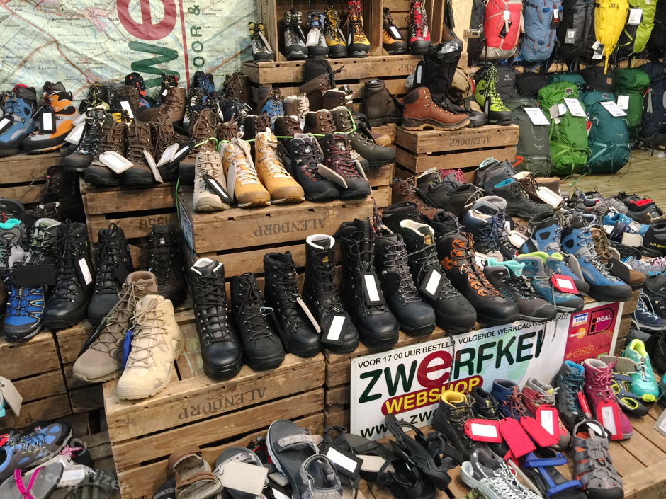 Bij het Buff-winkeltje kwam ik eerst fotograaf Bas van onder andere Ligfiets& tegen en daarna Theo, redacteur van Ligfiets.net. Theo was het opgevallen dat er maar weinig kampeerspullen waren op de beurs. Dat klopte. Er was een stand van Decathlon, Zwerfkei en Outdoor XL maar die laatste twee hadden vooral schoenen, rugzakken en kleding meegenomen. Jammer. Een paar jaar geleden was de Fiets- en Wandelbeurs voor ons echt een eye opener om te zien hoeveel kampeermaterialen alweer waren geëvolueerd en een stimulans om een paar zaken te vernieuwen.