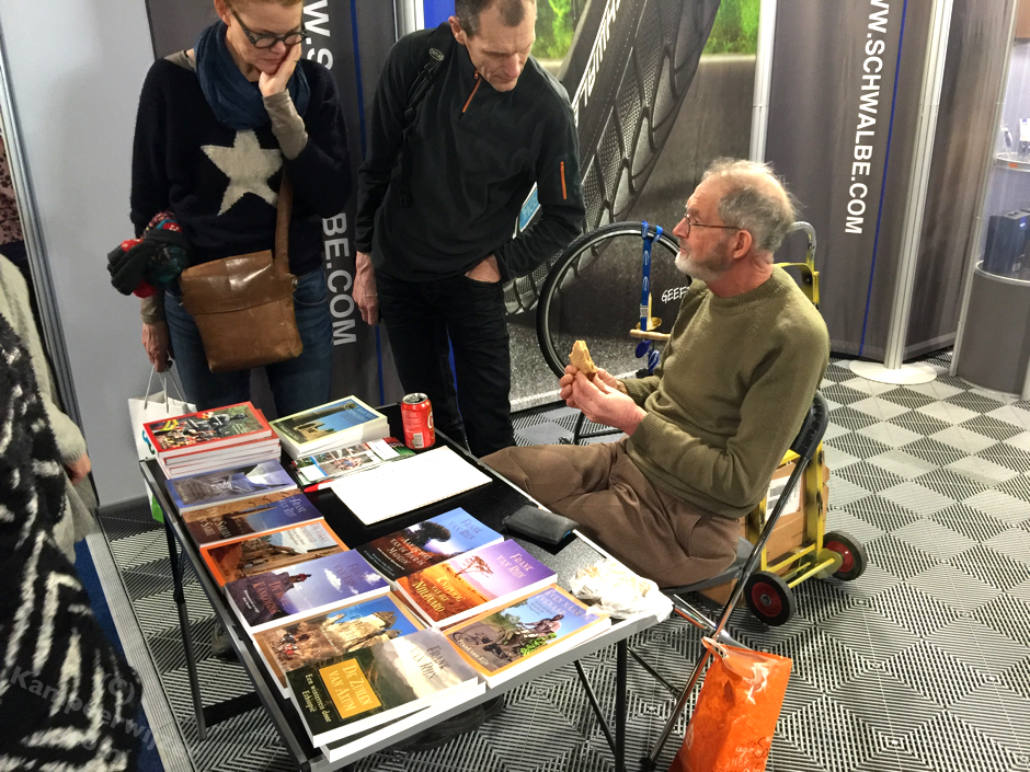 Dezelfde onvindbaarheid gold voor de stand van Paul Benjaminse, van de beroemde routeboekjes. De kleine stand stond ingeklemd tussen Rose Bikes en Schwalbe en niet in de hal 4 waar je ze zou verwachten, bijvoorbeeld in de buurt van uitgeverij Pirola (ook routeboekjes) en de Europafietsers. Ik wilde van Benjaminse het boekje kopen ‘Fietsen naar Rome, deel 1’ omdat die route ons deze zomer naar het Zwarte Woud voert. Na een leuk artikel in Op Pad (stonden ook op de beurs) hebben we namelijk besloten een bestaande route te gaan volgen in plaats van zelf een route te maken.