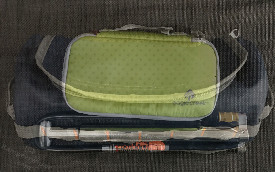 Zo werd elk item aan een kritische blik onderworpen. Het resultaat is dat nu alles zit in een Eagle Creek ‘quarter cube’ van 20 x 10 x 6 cm van 57 gram inclusief polstering. Het gewicht met gereedschap is 475 gram, exclusief binnenbanden en fietspomp.