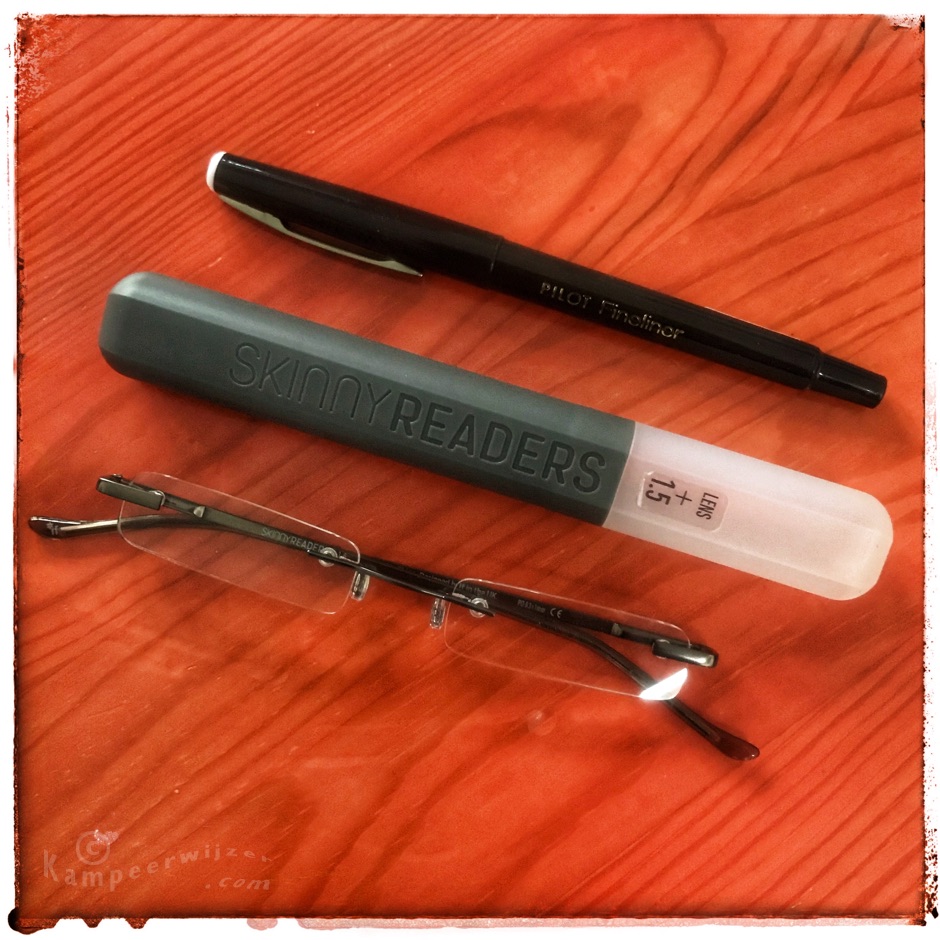 Nog smaller is de verpakking van Skinny Readers. Een brilletje zonder montuur. Smal, maar je kan ‘m precies zo positioneren dat je er goed doorheen kunt kijken. De dop klikt mooi stevig vast en is geheel van kunststof. Gevonden bij Zwerfkei voor € 14,95.