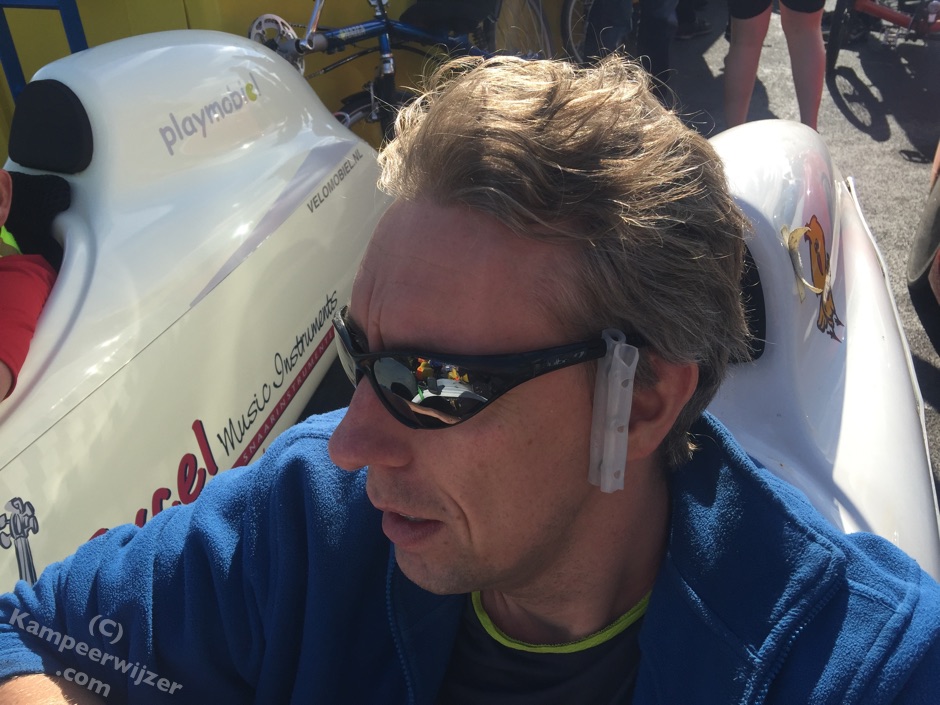 Andere ligfietsers hebben ook eigen oplossingen tegen windgeruis geknutseld, hieronder Gerard en Victor op het Herfsttreffen van de ligfietsvereniging vorig jaar.