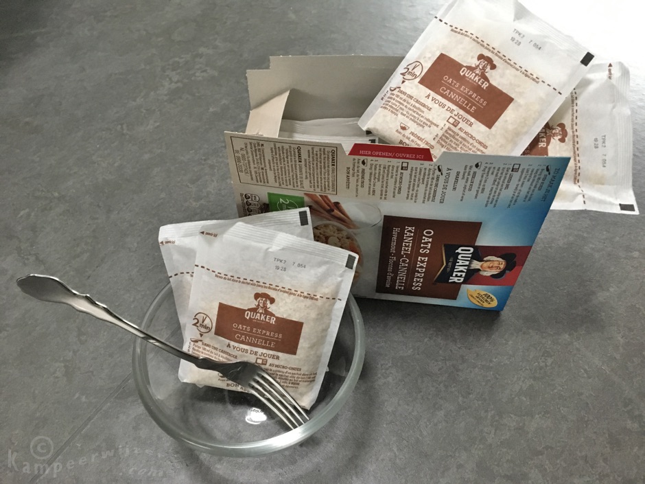 De supermarkt verkoopt havermout in dozen met handige portiezakjes. Dat is goed nieuws voor de kampeerder. Geen geknoei met een grotere geopende verpakking, die lastig mee te nemen is, en je hoeft niet zelf porties te maken.