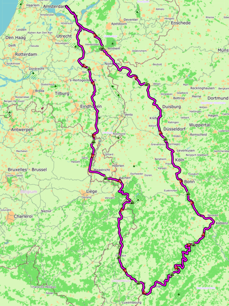 Totale lengte van de route, zoals die op dit moment in gedachten hebben, bedraagt 1136 kilometer – zonder de fiets- en wandeluitstapjes in de Eifel. Deze lengte is ook gekozen omdat Dave maar maximaal drie weken achter elkaar vakantie kan opnemen.