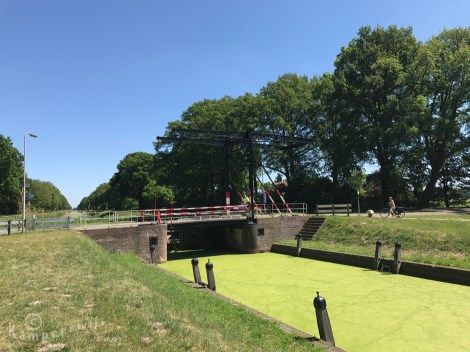 De tweede dag leek het thema ‘kanalen’ te hebben. Met het tropische warme weer was uitzicht op water wel lekker. De route liep onder andere langs het Overijssels kanaal, kanaal Almelo-De Haandrik, een kanaal met de naam Verbindingsleiding en we kruisten het kanaal Almelo-Nordhorn via een stalen ophaalbrug. Hierbij ligt een trapsluis die 4,25 meter verval overbrugt. Deze Reutumse dubbele sluis is een industrieel monument omdat het kanaal sinds 1961 niet meer in gebruik is voor de scheepvaart. Er staat een houten schuilhut bij die de gewenste schaduw gaf tijdens de bio break. Even een krentenbol wegwerken. Langs het kanaal loopt een mulle zandweg.