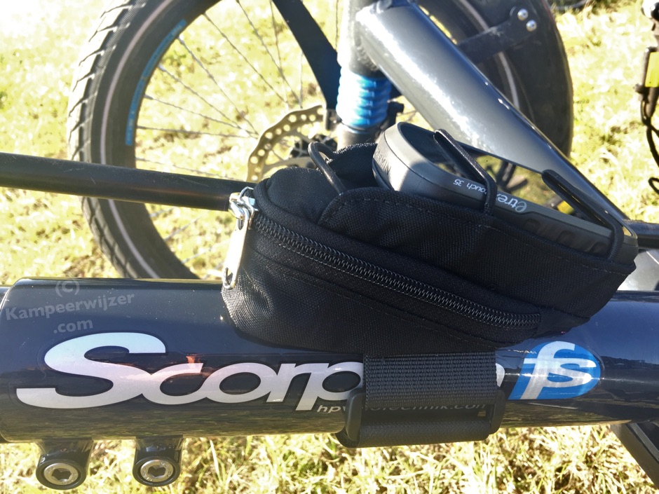 In eerste instantie plaatste ik mijn telefoon in een frametasje met een plastic raampje op de voorbuis. Ook handig voor allerlei kleine spulletjes die je bij de hand wilt houden (de trike heeft geen mogelijkheid voor een toptas). Maar telefoons kunnen daarvan overhit raken, wat ook gebeurde tijdens de Landelijke Ligfietsdag, toen ik mijn fiets in de zon had geparkeerd.