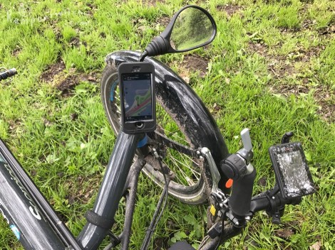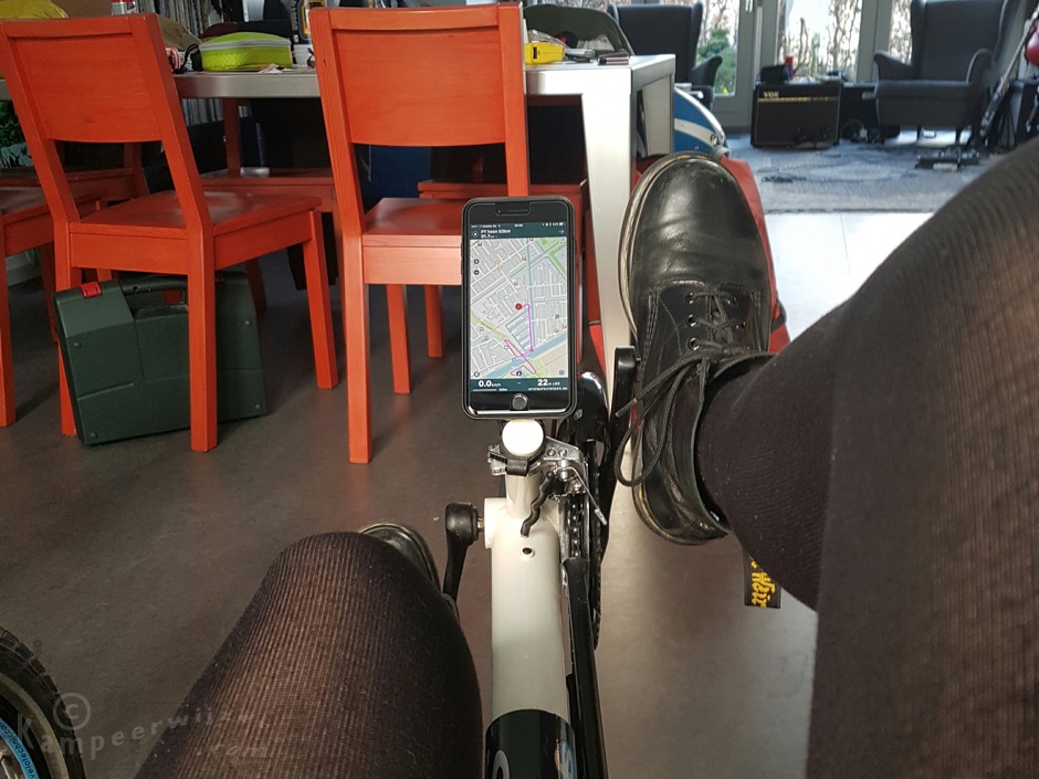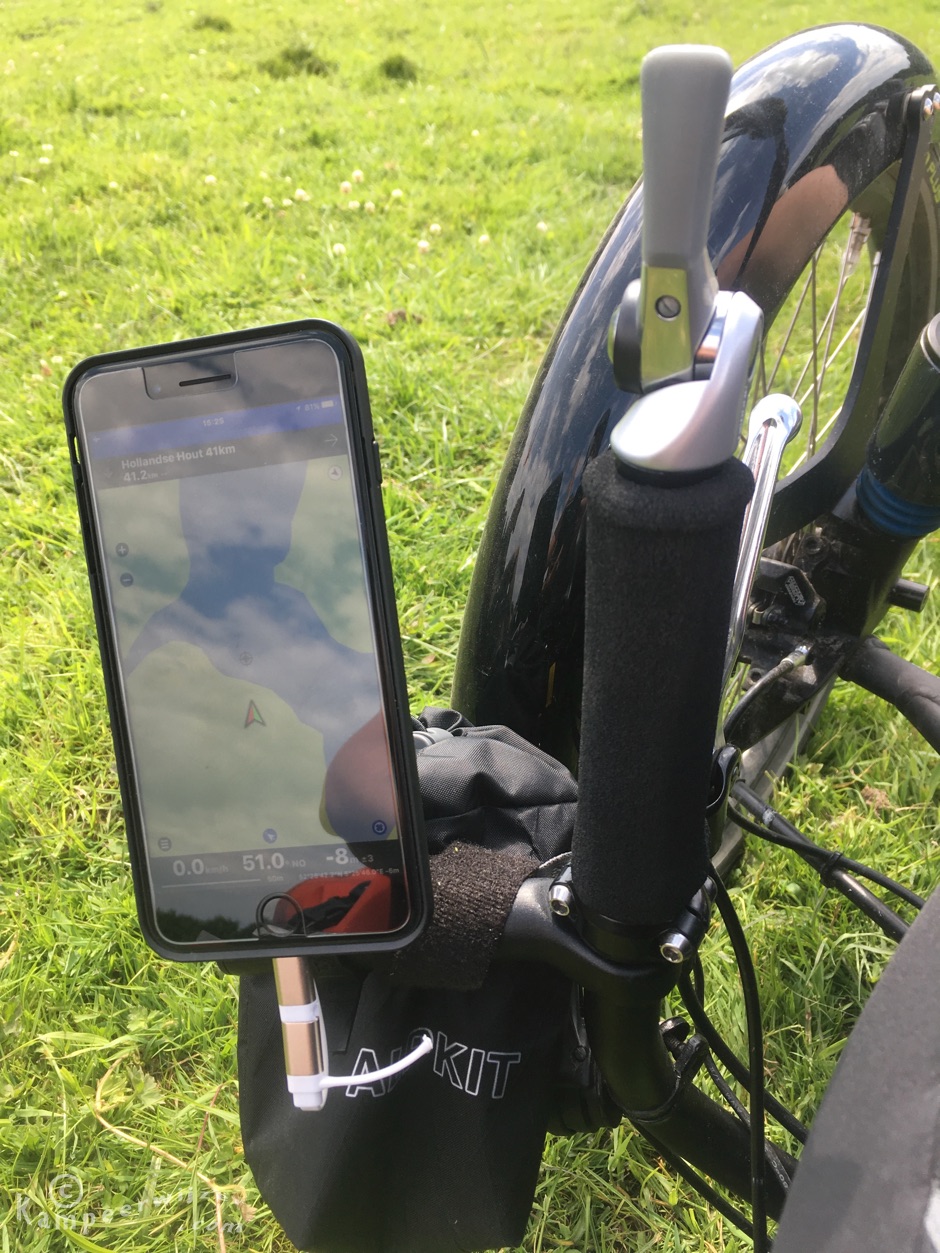 Dave kocht een hoes van Lifeproof Nuüd om zijn iPhone SE waterdicht te maken, mijn iPhone 7 Plus is al waterdicht, dus ik schafte de Topeak Ridecase aan om de smartphone op mijn fiets te zetten. In eerste instantie zette ik de smartphone op de spriet voor de voorderailleur. Vanwege de grootte van het scherm was de navigatie zo goed afleesbaar maar ik had nog wel last van zonlicht van achteren. Ondanks dat het er eng uitziet zo tussen je voeten werkt deze oplossing prima. Maar het was niet makkelijk om even de telefoon te pakken voor het maken van een foto.