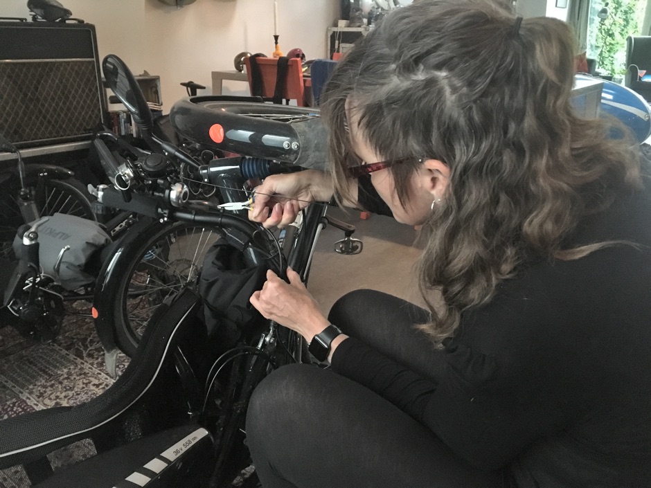 Onderweg kan je je telefoon opladen met een powerbank, bijvoorbeeld tijdens een lunchpauze. Dit kan echter ook tijdens het rijden. Met klittenband heb ik een stem cell (afgekeken van bikepacking) aan het bar end gehangen. Hier kan ik een powerbank in stoppen en het draadje eruit laten komen om de telefoon onderweg op te laden. Zo’n stem cell is een handig waterafstotend afsluitbaar zakje ter grootte van een flinke koffiemok waar kleine dingetjes inpassen die je onderweg graag bij de hand hebt, zoals kleingeld voor de veerpont en een tubetje zonnebrandmiddel. Maar opladen kan nog mooier als je een elektrische trike hebt!