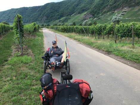Het Moezeldal is erg indrukwekkend. Eindeloos patchwork patronen van wijnranken op de heuvels van het dal, afgewisseld met rotspartijen en bossen. Het fietspad is fijn, soms wat scheuren en gaten maar vaak ook mooi glad asfalt. Het loopt veelal direct langs de oever en is voor 95 procent autovrij. Soms rij je tussen de wijnvelden. Omdat we met de stroom meefietsen van west naar oost, dalen we licht. Dit is net zo relaxt als fietsen in Nederland maar dan met indrukwekkende uitzichten.