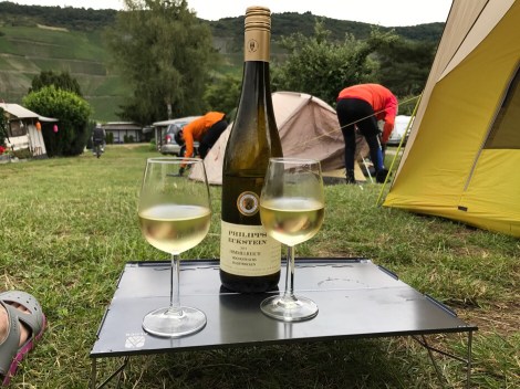 Ik had langs de Moezel grote commerciële campings verwacht maar Treviris bij Trier was kleinschalig alsook de wat rommelige camping Schenk waar we vanavond staan. De grappige eigenaar verkoopt wijn en toen we dreigden die te gaan drinken uit plastic bekertjes kregen we twee glazen te leen. Mooi die wijncultuur hier.