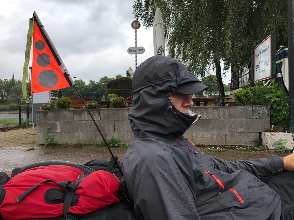 Gisteren van Echternach naar Trier gefietst door de stromende regen. Dit ligt slechts 34 kilometer uit elkaar. De tent drijfnat moeten inpakken, dus het slecht-weerprotocol was van toepassing: bij Trier hebben we ingecheckt in een hotel, dat we via de uitstekende Bett+Bike app vonden. Wel jammer, camping Treviris zag er leuk uit: veel kleine tentjes, direct aan het water en plekken om droog te zitten.