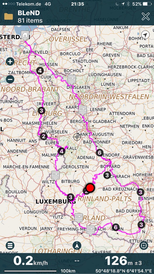 De Saar-variant bleek toch te ambitieus: bijna geen rustdagen en meerdere etappes van over de 120 kilometer. Die afstanden konden we met de velomobiel in Denemarken prima afleggen maar met het klimmen en dalen hier is tachtig kilometer op een dag een realistischer streven. Zeker als je de volgende dag weer verder moet en boodschappen doen, ben je het liefst voor 17.00 uur op de volgende camping. Nu zijn we ook wel langzamere starters, we zijn na twee koppen koffie en ontbijt meestal pas rond 10.00 uur op pad.
