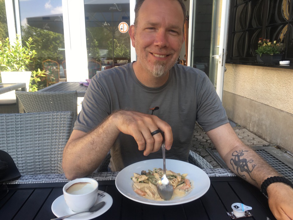 We hadden onderweg in een van die dorpjes wel een geweldige lunch op een binnenplaatsje in de schaduw: een lekker bord pasta met champignons, reepjes kalkoen en kaassaus.