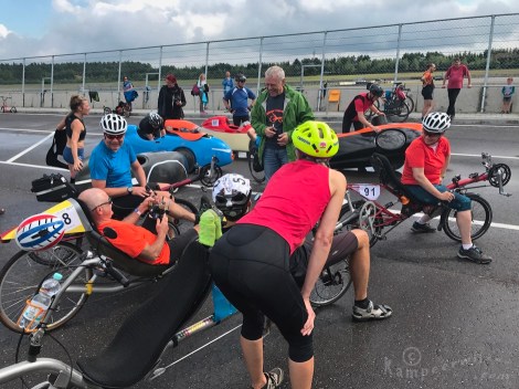 Na het eten fietsen we een rondje over de prachtige racebaan van het park. Deze heeft allerlei verschillende bochten en is 2300 meter lang. Elke dag is er tijdens het evenement de mogelijkheid om er vrij op te fietsen, als er geen races zijn. Voor de wedstrijden hebben zich 114 renners van tevoren ingeschreven. Sommige deelnemers zagen af van deelname aan de races op zaterdag, door het slechte weer in Meppen. Zij hoopten op beter weer de volgende dag. Sommige grote renners ontbraken, zoals Peter C. en Ymte. Naast de renners zijn er nog de vrijwilligers en ook supporters zijn welkom, mensen die hun kinderen begeleiden of door een chronische ziekte of blessure zelf niet meer mee kunnen racen. Hoe anders dan tijdens het WK in Mannheim eerder dit jaar, waar supporters niet welkom waren om te kamperen bij de deelnemers omdat ze door de organisatie gezien werden als “Trittbrettfahrer”, Duits voor klaplopers. Een reden voor ons om dit evenement links te laten liggen.