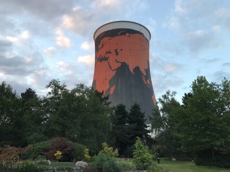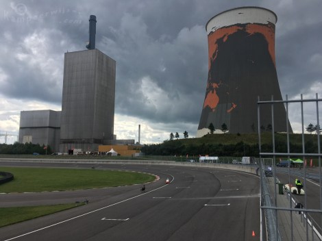 Dan duikt de koeltoren van Funpark Meppen op met zijn karakteristieke beschildering van de wereldkaart. Al vaak zien liggen in de verte als we in de buurt waren, maar nu wijs ik hem aan en roep enthousiast tegen Dave: “dáár gaan we naartoe!” Een paar kilometer verder staat in de berm een bord dat we hier moeten afslaan voor het evenement A Race In The Park.