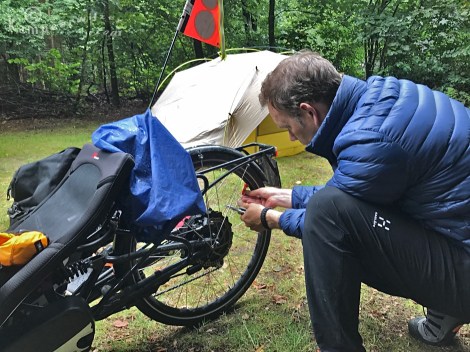 Op het kampeerterrein in het bos vindt Dave een nog rondwandelende teek op zijn been. De volgende ochtend vind ik er een op mijn pols die ik niet op tijd heb ontdekt. De teek is te klein voor mijn tekentang dus verwijderen gaat niet volgens het boekje. ’s Nachts is er regen gevallen maar ’s ochtens zitten we lekker voor de tent aan de koffie en ontbijten we met ons favoriete ‘expedition breakfast‘, dat we met lange lepels rechtstreeks uit de verpakking eten.