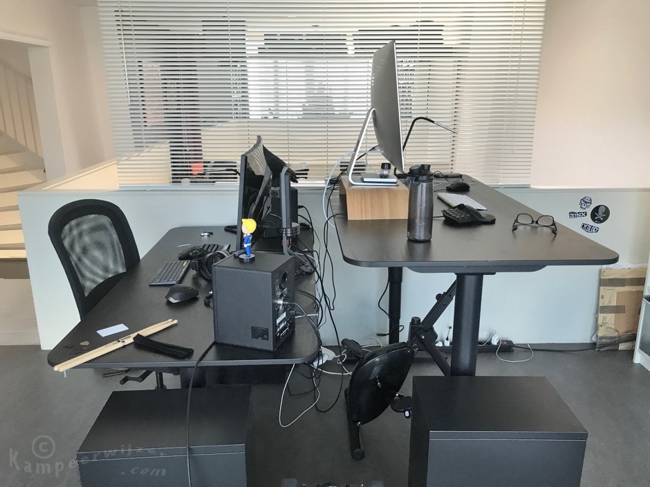 Als stabureau’s kozen we voor de BEKANT van IKEA. Dit bureau is elektrisch in hoogte verstelbaar (en verkrijgbaar in verschillende maten en afwerkingen). Dan kan je af en toe ook nog je bureaustoel aanschuiven. Op dagen dat je bijvoorbeeld wat minder fit bent. De Deskbike schuif je tijdens het staan weg onder het bureau. Dit gaat makkelijk want de fiets staat op vier wielen. Ondanks de wieltjes schuif je niet weg onder het fietsen en staat de bureaufiets stabiel.
