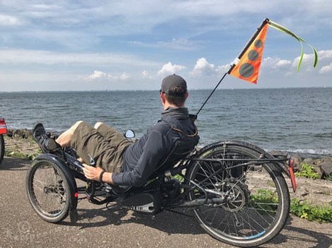 Puur om van het gezeur “er moet een vlaggetje op” af te zijn, kochten we vorig jaar ieder een vlaggetje voor op de fiets. Sindsdien hebben we beiden het idee dat we toch vaker opgemerkt worden, ondanks wat er aan verhalen rondgaat binnen de ligfietsvereniging.