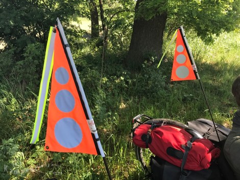 Alleen lui die nog nooit op een ligfiets hebben gezeten weten zeker dat er een vlaggetje op moet. De meeste ligfietsers hebben er een broertje dood aan of zetten er alleen een op om van het gezeur af te zijn. Eén van de argumenten tegen een vlag is dat deze van voren slechts een streep is ter breedte van het stokje. Maar dat is alleen zo als er niets wappert aan de stok. Wellicht ligt het sneller opgemerkt worden aan het type vlaggetje dat we gekocht hebben, een Bikeflag van TraumVelo. Die is wat groter, maakt gebruik van reflecterende materialen en heeft een extra wapperende wimpel. Die wordt ook niet zo snel aangezien voor iets dat op een kinderfiets zit met bijbehorend verwacht tempo.