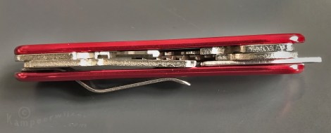 Zoals te zien is op de foto met het zijaangezicht, heeft de KeySmart Rugged een extra clip die ruimte inneemt aan de binnenkant. Dat kwam in mijn geval goed uit omdat één van de sleutels krom bleek. Na een uurtje puzzelen speelplezier had ik het dankzij de clip en de kromme sleutel voor elkaar om ook de flessenopener te plaatsen bij een even aantal sleutels, zonder gebruik te hoeven maken van de meegeleverde spacers.