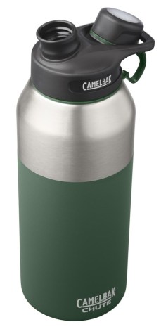 Bevroren of ijskoud water drinkt niet lekker, dus voor de winter gebruiken we liefst een thermosdrinkfles. Aangezien er in allerlei siliconen drinktuitjes alsmaar vage zwarte smurrie groeit die je er op een gegeven moment op geen enkele manier meer uitkrijgt (BioTex, Steradent, soda, vriesvak, kokend water, manueel – alleen een vlammenwerper restte nog als optie) zijn we overgestapt op de Camelbak Chute. Die combineert een hele prettige drinkopening met een wijde dop voor reiniging. Het kleine dopje klik je vast in het handvat. In het begin gaat dat nog wat stroef maar na een week of wat heb je er handigheid in en gaat het makkelijker. Nu hebben we van de Chute de voor de winter geschikte thermosvariant aangeschaft met een inhoud van maar liefst 1,2 liter. De Camelbak Chute Vacuum is een forse fles maar er is een kleinere versie met slechts 0,6 liter inhoud. Er bestaat een versie van een liter maar die hebben we nog niet kunnen vinden op de Europese markt. Past dus niet in een bidonhouder maar kan in een velomobiel prima naast de stoel liggen of vervoerd worden in zijvak rugzak of voorvak fietstas. Deze fles houdt vloeistof 24 uur koud en 6 uur warm maar wij vinden het prettig als het water op kamertemperatuur blijft. Op de camping voorkom je dat je water bevriest en ’s ochtends kan je er gekookt water in warm houden voor een tweede kopje koffie. De gekleurde coating heeft behalve een esthetisch ook nog praktisch nut: de RVS-fles is hier minder koud om vast te houden.