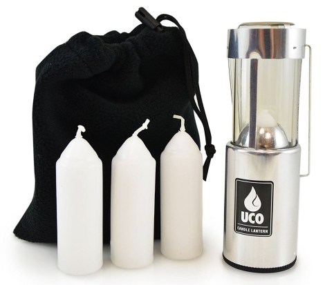 In de winter is het vroeg donker. Natuurlijk kan je een LED-lampje gebruiken voor verlichting maar een kaarslantaarn kan je ook nog in een pan in de voortent zetten voor licht en wat extra warmte. Die van ons gaat al 25 jaar mee en is van EMS, the original candle lantern. Tegenwoordig worden ze gemaakt door UCO. Ze wegen 181 gram in aluminium uitvoering. Er gaan van die langdurig brandende kaarsen in die negen uur meegaan. De kaarslantaarn blijft in de zomer thuis omdat we ‘m dan niet gebruiken vanwege de late zonsondergang.