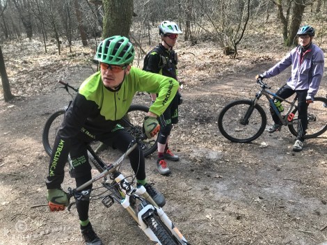 Vanaf de Kerkallee in Velp zit je zo in het bos bij Rozendaal. De eerste paar oefeningen deden we op een licht hellend onverhard pad. De heuvel op moesten we op de pedalen gaan staan en de fiets onder ons van links naar rechts bewegen, dit werd de BMX-stijl genoemd. Hierbij leerden we dat het belangrijk is dat het lichaam gecentreerd blijft terwijl de mountainbike vrij onder je allerlei bewegingen kan maken. Dalen moesten we in de basistand doen: met het midden van je voet op de pedalen staan, cranks horizontaal, het lichaam in een open ontspannen houding, met de knieën licht naar buiten en ook de ellebogen naar buiten gebogen. Heuvelafwaarts rem je slepend met beide remmen, zodat je wielen niet blokkeren. Ook fietsen doe je met gebogen armen, ellebogen naar buiten en een beetje met O-benen, zodat de knieën niet klemmen tegen het frame. Een mountainbiker houdt dus voornamelijk contact met zijn fiets met zijn handen en voeten. Kijk ver voor je uit, dan kan je nog tijdig anticiperen op kuilen, stronken, bochten, etc.