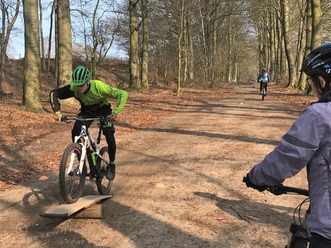We moesten over wipwaps fietsen en over halve boomstammen bunny hoppen: eerst het voorwiel omhoog trekken en daarna het achterwiel. Dat kan in theorie met je pedaal halverwege je voet terwijl je tenen naar beneden wijzen. Zo klem je de fiets tussen je armen en benen en kan je deze omhoog wippen. Anders wip je alleen maar jezelf van de trappers af. Mij lukte het niet maar was prachtig om te zien wat voor een stunts instructeur Tom allemaal stilstaand op zijn fiets kon uitvoeren.