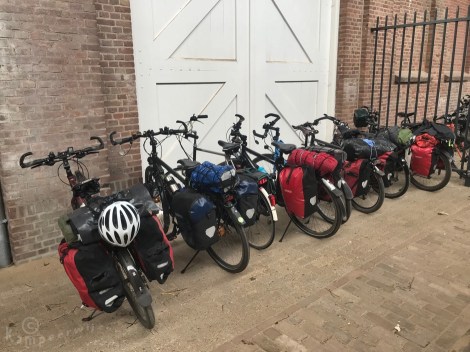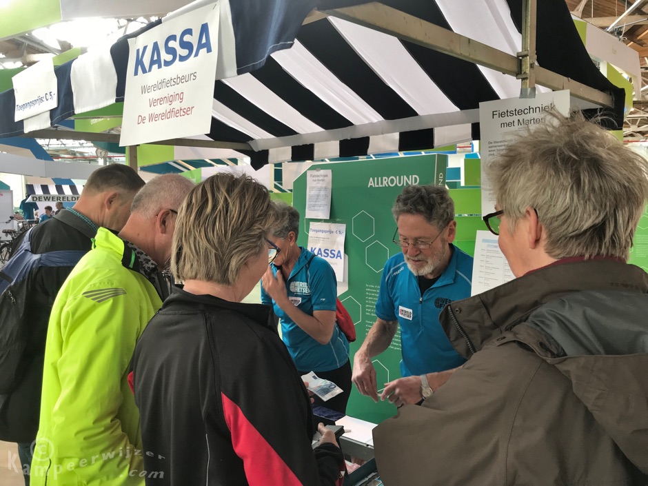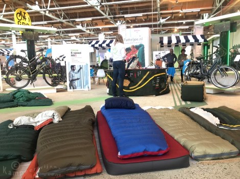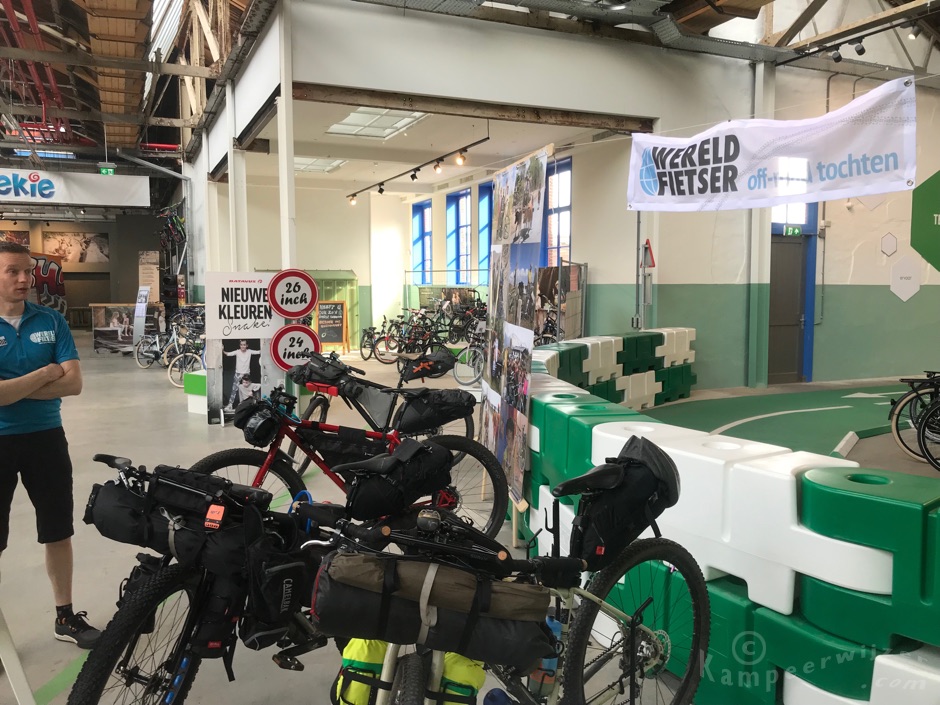 Ik was met roeifietser Ingmar naar de beurs gefietst, een stukje van nog geen zeven kilometer vanaf natuurkampeerterrein Landgoed Quadenoord, waar het bijbehorende kampeerweekend van de Wereldfietser werd gehouden. De fietsen met kampeerbagage konden mooi overdekt staan.