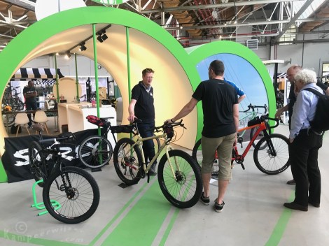 De offroad-tak van de Wereldfietser had een aparte stand met allemaal opgetuigde bikepackingfietsen erin. Er was een stand van Just Pedal, een speciaalzaak voor bikepacking-fietsen, met onder andere fietsen van Salsa en Surly. Ik heb een rondje gereden over de indoor testbaan met een Salsa Fargo. Eigenaar Jelle luistert goed naar wat je zoekt en nodig hebt. Het was voor hem geen moeite om even een paar pedalen te zetten op de Fargo. Omdat er een Salsa Woodchipper-stuur op zat, kon ik de fiets eigenlijk niet goed testen, daarvoor kan ik beter een keer langskomen in Amersfoort.