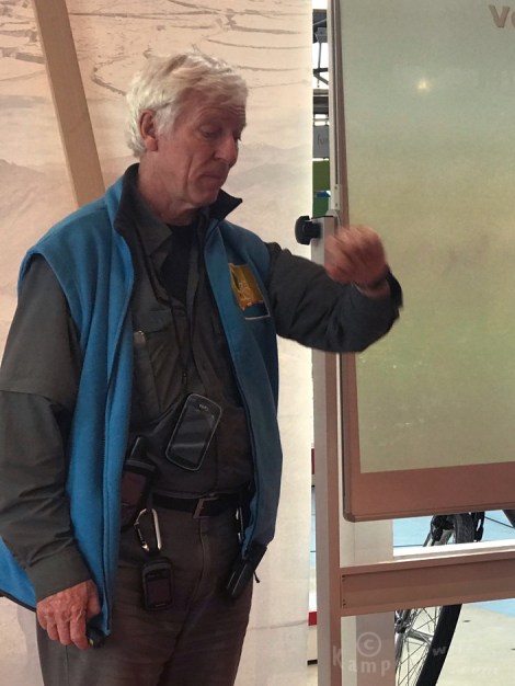 Na vijf lezingen van een uur hield ik het voor gezien en kon ik eindelijk de stands bekijken. Dat viel eigenlijk nog niet mee. Ik heb bijvoorbeeld niet de kraam gezien met Cor en Ingmar over roeifietsen. Een deel van de beursstands stond goed herkenbaar langs een muur maar sommigen stonden verdekt opgesteld tussen de permanente tentoonstelling van de locatie in. Zelfs de grote stand van Tatteljee, met allemaal matjes en slaapzakken op de grond, viel een beetje weg in het grote geheel.
