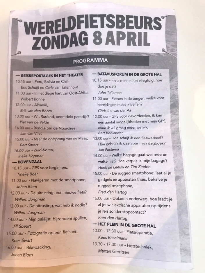 Een blik op het programma leerde mij dat ik vandaag vooral in het Batavusforum in de grote hal en de Bovenzaal zou vertoeven, waar tijdens de beurs allerlei praktisch gerichte lezingen werden gehouden over zaken als je fiets meenemen in het vliegtuig, een gevordencursus GPS, een lezing over bijzondere spullen op de paklijst en een pleidooi om alle apparaten thuis te laten op een stevige smartphone na. In een zaal met de naam Theater waren alle lezingen over reizen. Deze heb ik niet bezocht. Wel mooi om te zien dat de bestemmingen van deze lezingen vijf van de zeven continenten besloegen.