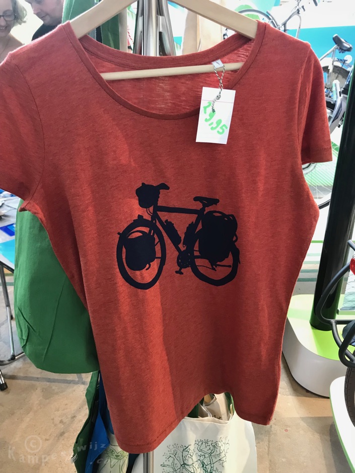 Er was ook een stand van SillyScreens met “organic T-shirts for bycicle lovers”. Eén van de afdrukken is die van een vakantiefiets. Een bikepackingfiets zit nog niet in het assortiment. Op het foldertje dat je bij de ingang kreeg, zag ik dat er behalve heel veel stands over fietsbestemmingen ook een kraam heeft gestaan met informatie over gastvrijheidsnetwerken zoals Couchsurfing, Warm Showers en Dachgeber (de Duitse variant van Vrienden op de Fiets). Dit lijkt me ook een interessant onderwerp voor een lezing.