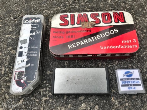 Er zijn tegenwoordig minidoosjes met zelfklevende plakkers in de handel. In mooie aluminium doosjes of simpel plastic. Voordeel: er is geen tubetje bandenplakmiddel meer nodig. Dit heeft een aantal voordelen: