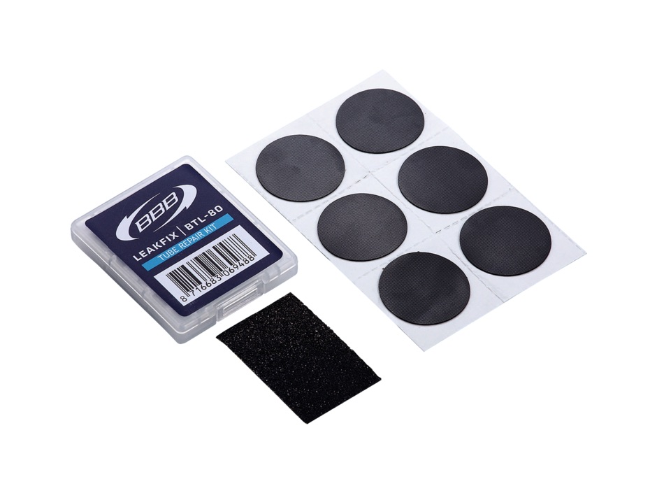Een eenvoudig plat plastic doosje, dat is het BBB LeakFix BTL-80 plaksetje. Inhoud: zes zelfklevende ronde plakkers en een stuk schuurpapier.