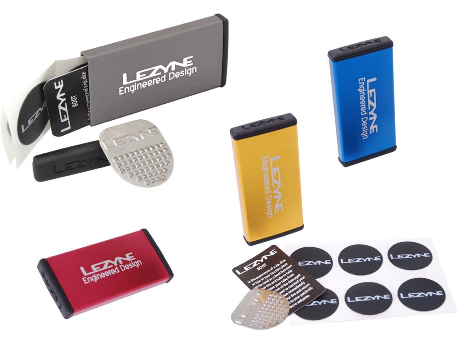 De Lezyne Metal Kit is waterproof, bevat een metalen raspje ter grootte van een plectrum om je band mee op te schuren en zes ronde zwarte plakkers voor binnenbanden met het opschrift ‘Lezyne’. Er is tevens een inlegger (tyre boot) voor als de buitenband beschadigd is, om tijdelijk tussen binnen- en buitenband te leggen. Deze plakker is dus wat groter en steviger. Het doosje is verkrijgbaar in de kleuren aluminium, zwart, paars, rood, lichtblauw en goudgeel. Zie voor de grootte in verhouding met andere doosjes bovenste foto’s.