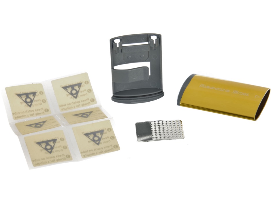 De Rescue Box van Topeak komt in meerdere kleuren: rood, zwart, goudgeel, aluminium en blauw. Het bevat een stukje schuurpapier en zes vierkante plakkers. In de houder kan ook een missing link bewaard worden en twee pinnetjes (niet bijgeleverd).