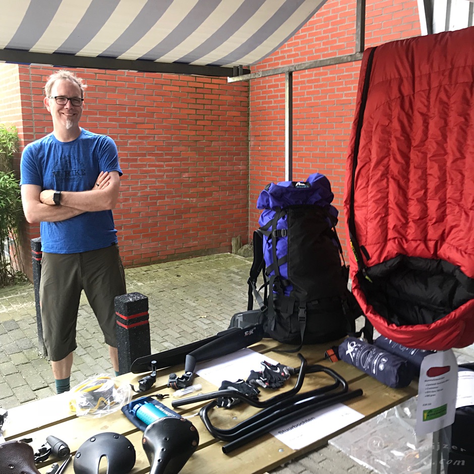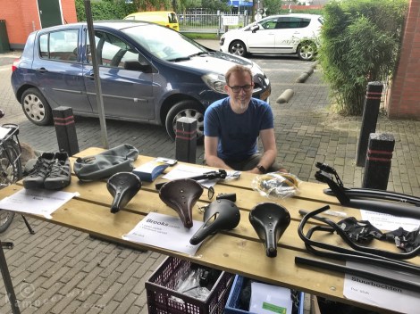 We hadden de meeste fietsspullen bij Dave in de kraam gelegd zoals een Thudbuster, die niet meer past op de nieuwe fiets, Brooks-zadels die te smal waren voor onze zitbotjes, een fietstasje voor op je bovenbuis voor je smartphone, stuurbochten, fietshandschoentjes die te klein waren geworden, een bidonhouder voor een PET-fles. Bij mij lagen schoenen, veldkeukenartikelen als pannensets en thermosflessen en mokken. Veel interesse was er ook voor onze oude Gazelle Kathmandu trekkingsfietsen ontworpen in samenwerking met Frank van Rijn maar niemand hakte uiteindelijk de knoop door. Er blijken mensen te bestaan die Frank van Rijn niet kennen.
