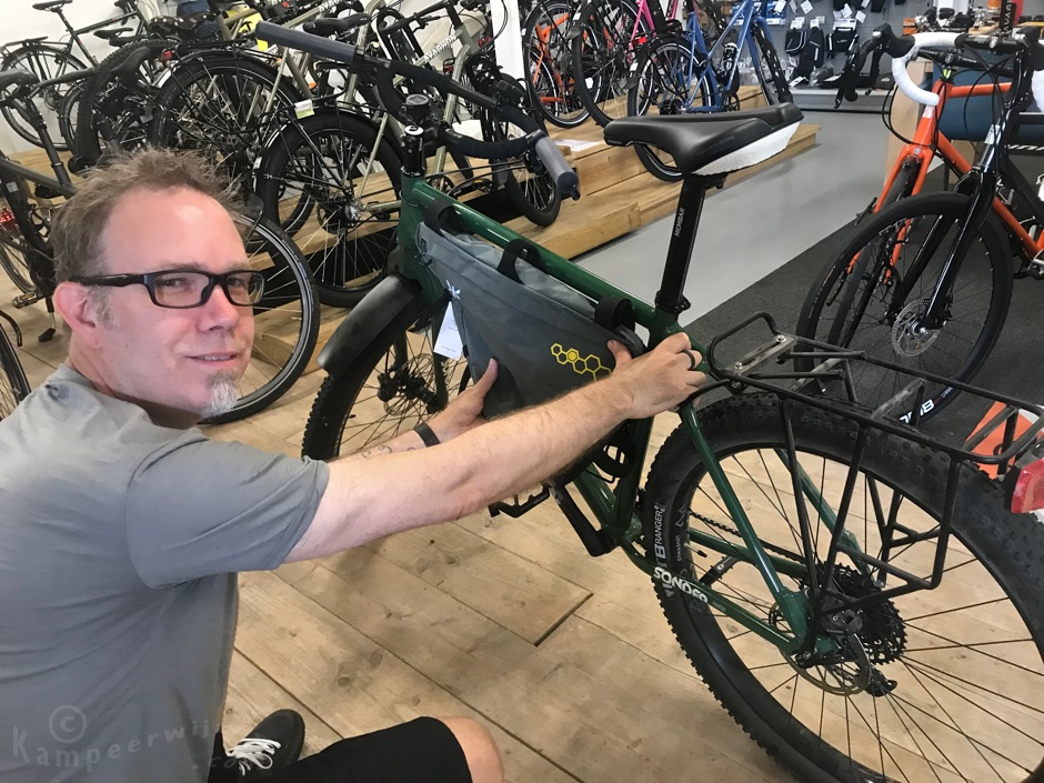 Frametassen zijn de bikepacking fietstassen die in de driehoek van je frame passen, waardoor de maat en verhoudingen heel precies komen. Die maten kan je online vinden maar het leek ons toch beter om de tassen te passen. Daarvoor togen we met de fietsen naar Bike4Travel in Rotterdam.