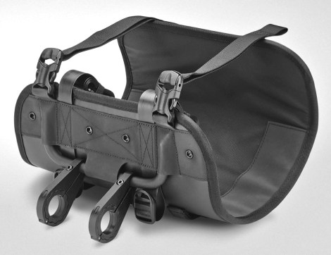 Gezien de opmerkingen van Adriaan dat met name de remkabel van de linker handle nogal in de knoop komt te zitten als je er een stuurtas tegenaan drukt, viel Dave’s oog op de Handlebar-Pack (M) van Ortlieb, die een soort afstandhouders van foam heeft. Hierdoor komen de kabels wat minder in de verdrukking. Testweekenden moeten uitwijzen of dit goed werkt in de praktijk en de hydraulische remkabels heel blijven. Bijkomend voordeel is dat de Ortlieb-bikepacking tassen goed waterdicht zijn.