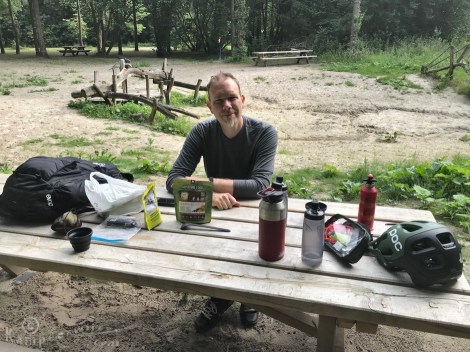 Na het inpakken van de bikepackingtassen, gingen we richting het kraantje. Hier staan picknicktafels, waar we comfortabel ons ontbijt nuttigden. Na het ontbijt vulden we onze bidons en fietsten we weer naar huis. Daarbij reden we door het gebied De Grote Trap, voorheen bekend als Oostvaarderswold. Hier wordt in de toekomst een fietspad aangelegd maar het is nu nog lekker wild en ruig met onverharde paden die ontstaan zijn door de rupsvoertuigen die hier de natuur aan het aanleggen zijn. Een acht kilometer lange mountainbike speeltuin, voor zolang het nog duurt. De strook loopt helemaal van de Ibisweg tot de Schollevaarweg. Bij de Ibisweg staat nog een oud bordje met ‘Welkom’ van het Flevolandschap maar aan de andere kant tref je hekken en een camera van BouWatch. Dus beetje onduidelijk of je hier nu wel of niet mag fietsen en wandelen. Ik denk dat de camera er alleen staat om te voorkomen dat er bouwmaterialen worden gestolen, er staat geen bord met ‘verboden toegang’.