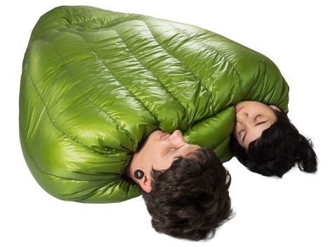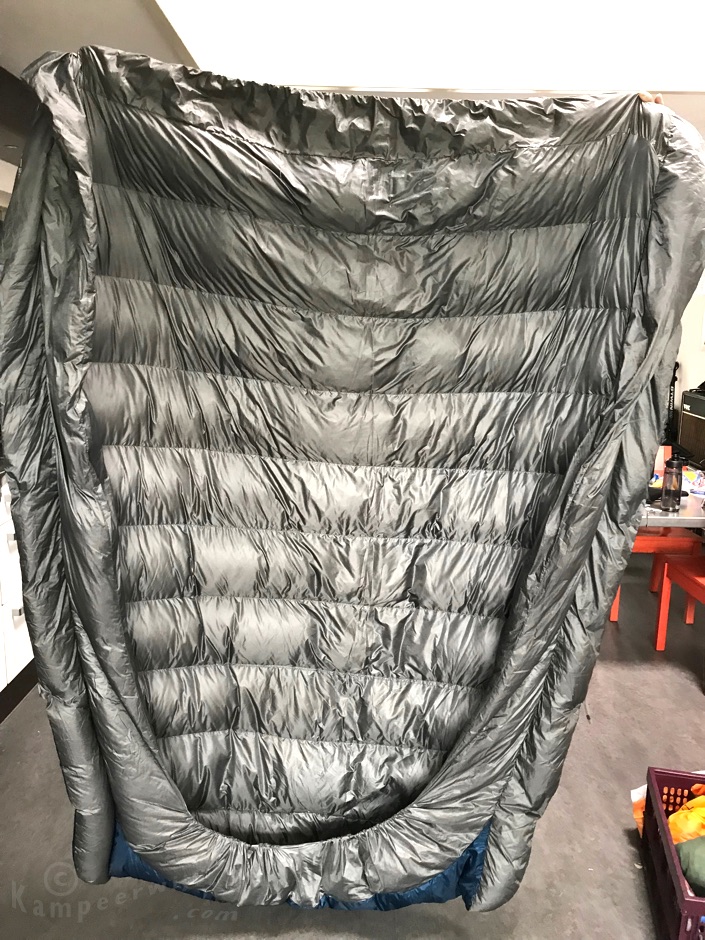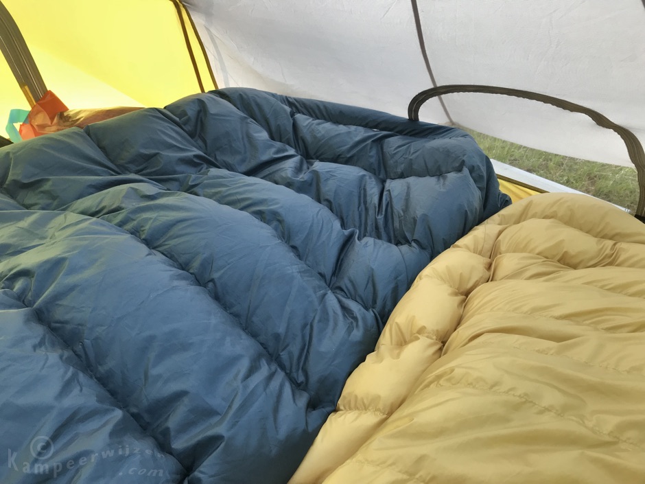 Wij hebben jaren geleden het tegenovergestelde vastgesteld en slapen sindsdien ieder in onze eigen mummyslaapzak. Hoe minder loze luchtruimte je moet opwarmen, hoe beter. Maar misschien was deze opvatting toe aan een revisie. Misschien werkt elkaar warmhouden wel en het leek ons bovendien gezelliger om samen onder een quilt te slapen. Therm-a-Rest is redelijk betaalbaar en als het niet zou bevallen, dan hebben we altijd nog een fijn dekentje voor op de bank.