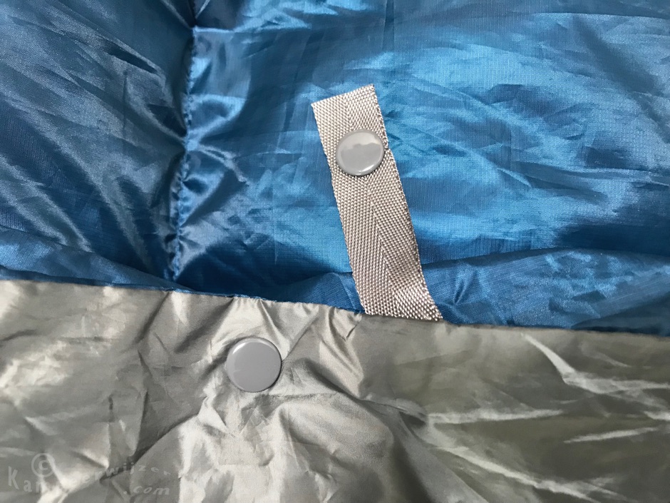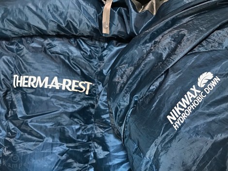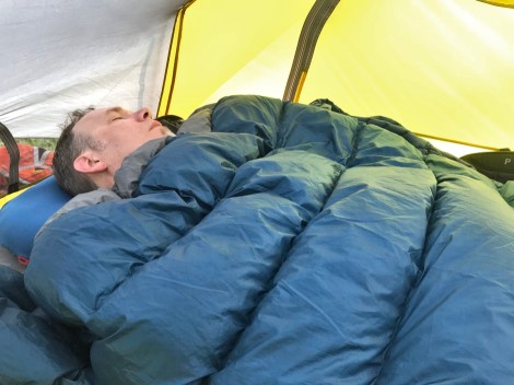 We sliepen tijdens het testweekend speciaal op matten van Therm-a-Rest met een ‘coupler’, dat is een onderlaken om twee matjes aan elkaar vast te maken. De Synergy Coupler die wij gebruikten heeft speciale lusjes waar je de quilt aan kunt vastmaken. Eerst hadden we bijna alle lusjes aan de zijkant vastgemaakt, later hebben we het nog geprobeerd met alleen het onderste lusje bij de voeten vast met het idee dat de quilt dan wat losser om ons heen kon vallen. Helaas bracht dat geen oplossing. Halverwege de nacht trok ik mijn voor de zekerheid meegebrachte slaapzak uit zijn zak en kon Dave de quilt voor zichzelf gebruiken. Hij sliep daar heerlijk onder. De quilt is lang genoeg voor zijn lengte (1,94 m.).