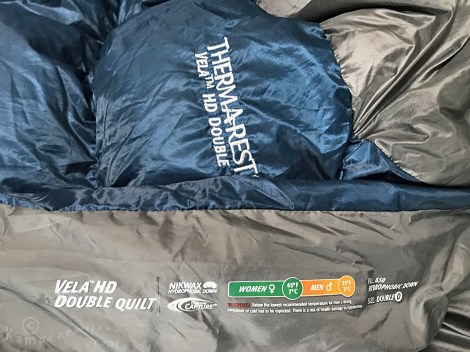 De Therm-a-Rest Vela HD double quilt is een budgetkeuze. De zak bevat 650 cuin (Amerikaanse rekenmethode) waterafstotend eendendons (ter vergelijk: onze topkwaliteit slaapzakken hebben 900 cuin volgens de Europese, strengere meetmethode en bevat ganzendons). De Vela-quilt heeft een comforttemperatuur van +7 graden en is dus uitsluitend geschikt voor gebruik in de zomer. Toch is de Vela heerlijk warm en wat ik innovatief vind: de naden zijn doorgestikt (goedkope, slechte methode die koude plekken creëert) maar die naden zijn getaped met reflecterend materiaal tegen warmteverlies. En dat werkt. Onlangs hebben we de quilt voor het eerst getest, tijdens een nachttemperatuur van +13 graden. Warm is de quilt zeker. Zelfs te warm voor bij deze temperatuur. Maar het fijne van een quilt is dat je die makkelijk ventileert door hem deels van je af te gooien.