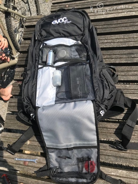 De rugzak heeft een brede (warme!) heupband en eveneens een matig geventileerd rugpand. Dan is een lang rugpand extra warm. De FR Trail heeft een handig uitlegbaar vak voor alle kleine dingen zoals fietsgereedschap en reserveonderdelen.