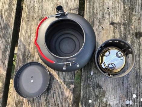 Het grote voordeel van dit setje is niet alleen de aanschafprijs maar ook het brandstofverbruik. In de winter moesten we met onze pannenset en Vargo woodstove de spirituscup een keer bijvullen om genoeg water te koken voor koffie, ontbijt en lunch (lunch gaat mee in thermospotten op de fiets). Met het keteltje hadden we nog brandstof over toen we genoeg water aan de kook hadden.
