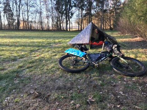 Ik heb heerlijk proefgeslapen op de slaapmat die Dave vorig jaar gekocht heeft. Over deze mat een volgende keer meer. Voor extra warmte hadden we een lichtgewicht noodreddingsdeken op het grondzeil onder de slaapmatten gelegd. Voor de zekerheid hadden we nog een extra dikke isolatiemat meegenomen maar die bleek niet nodig. Pas om half 9 is de zon zo hoog dat we zin hebben om eruit te komen. Eerst de koude kleding in de slaapzak erbij stoppen om op te warmen. Dan in het ochtendzonnetje koffie maken en ontbijt op het brandertje. Er zit rijp op onze frametassen en het gras.