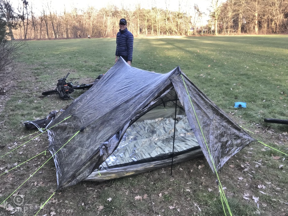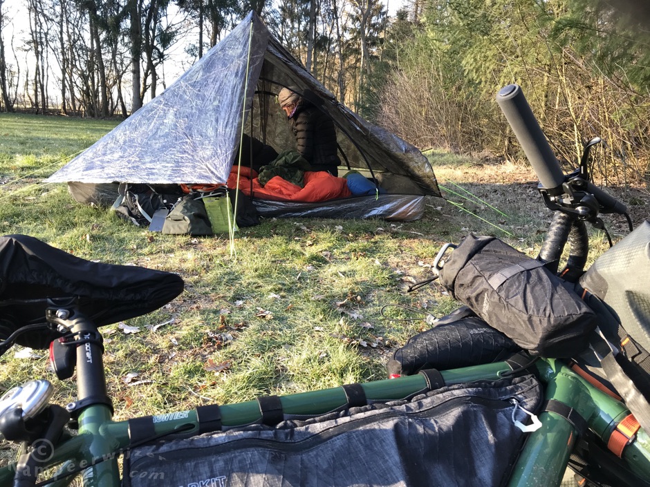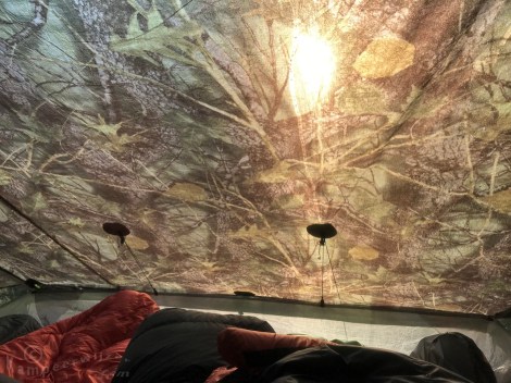 De nieuwe tent heeft wel wat weg van een tarp. Weliswaar heeft de Multiplex een kuipzeil, ben je beschermd tegen insecten dankzij muskietengaas en kan je jezelf tegen de elementen beschermen met stormflapjes. Het is de bedoeling dat deze stormflapjes alleen gesloten worden als het regent en waait. De tent heeft wel wat weg van onze vorige tent, een Sierra Designs Flash 3, met twee zijdeuren en een binnentent gaas. De Multiplex is een enkeldaks tent, gemaakt van Dyneema. Deze avond waait de win door de tent en er wordt vorst verwacht. We houden slechts één flapje open vanwege de kou.