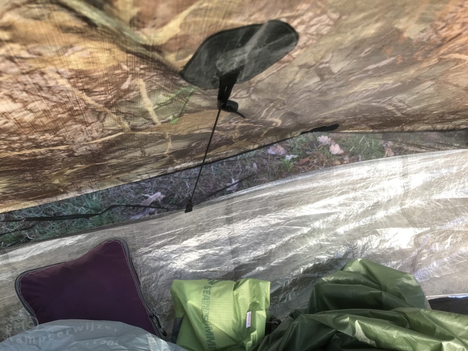 Als er één punt van kritiek te bedenken is, is het deze: het kuipzeil hangt ook aan de boogvormige ultradunne ritsjes die aan beide kanten de ingang vormen. Als je teveel spullen naast je bed legt, dan merk je met het sluiten van de rits bovenin dat dit gewicht aan de rits hangt. Daar moet je dus mee uitkijken. Het is dus beter om genoegen te nemen met een smallere mat of de spullen alleen bij je voeten te leggen. Een taps toelopende slaapmat is daarvoor handig.
