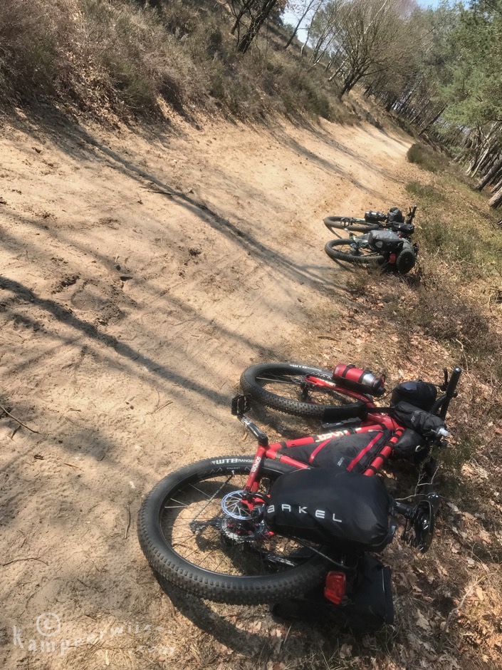 De zon schijnt volop, het is het laatste weekend van maart en we fietsen de hele dag in T-shirt. We stappen op bij etablissement Het Jachthuis in Hoog Soeren. Meteen zitten we in de bossen van Kroondomein Het Loo, op een pad dat redelijk stijl naar beneden gaat en meer weg heeft van een trap dan een pad. Het is gelukkig het enige stukje dat echt een mountainbike vereist. Hierna fietsen we langs de Asselsche Heide bij Hoog Soeren. We komen door een bos met veel tonderzwammen.